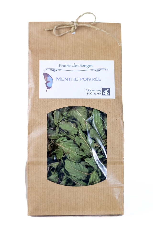 Découvrez les feuilles de Menthe poivrée issues des cultures de La prairie des Songes (Montbert, Loire-Atlantique).